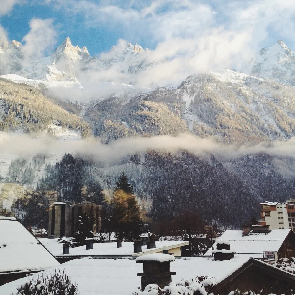 Chamonix is just as picturesque and wonderful as it always was and always will be. Apparently it had been snowing for the last few days, so we arrived into a town completely covered in fresh snow, with the mountains coming and going behind billowing clouds. There was still plenty of autumn colour around, which combined with the snow was exceptionally pretty.