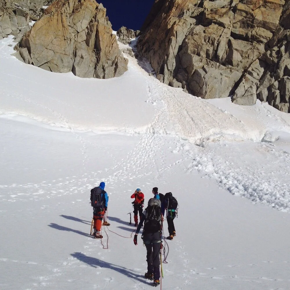 Our first day was spent walking to the cabin, then rock climbing on the super-solid granite of the Aiguilles d'Arpette, directly behind the hut. There are all levels of routes there in an amazing alpine environment, the rock is really grippy, and it's a bolted crag despite the fact that, at least where we were, the rock practically eats trad gear. While we climbed on lead clipping bolts our mountain guide soloed up and down wearing crocs.